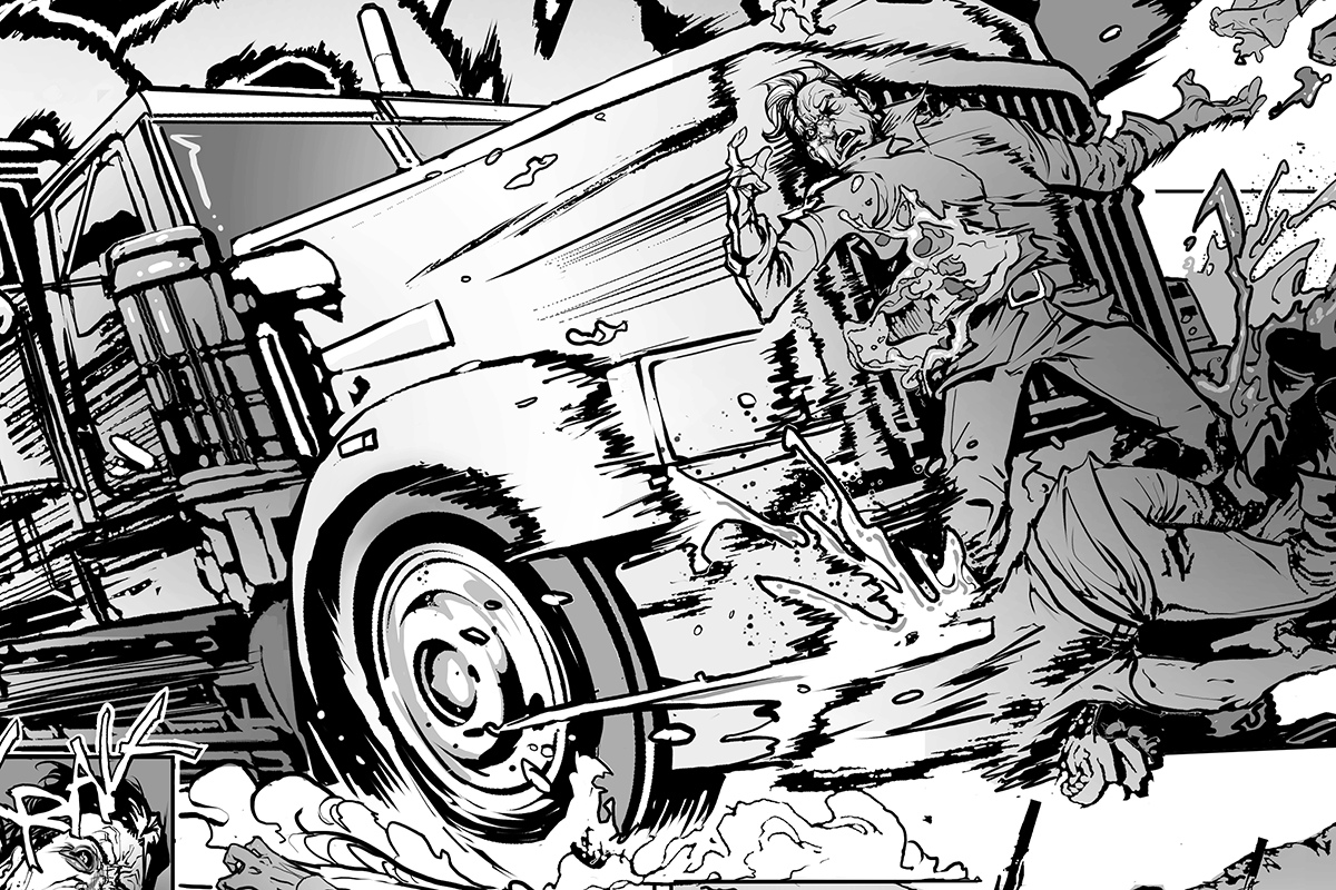 • “Insane, profane, spectacular. BIG RIG feels like Sam Raimi on steroids. Halfway through the first chapter I was like—wait, what the f*ck? Incredible art with action paced so well that you hear every sound effect in your head and feel the engine rumbling in your hands. Plus larger than life character work. BIG RIG is big fun.” — Eliot Rahal (Hysteria, Bleed Them Dry, Hot Lunch Special)
